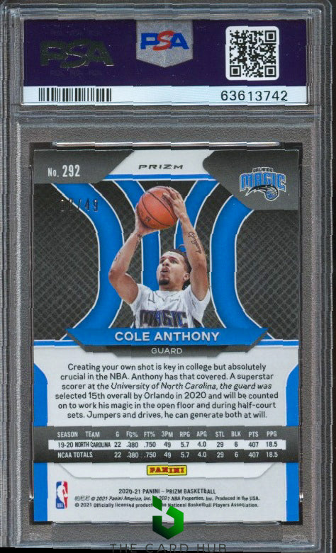 2020-21 Panini Prizm #292 Cole Anthony Orange Prizms PSA 10 #/49 RC