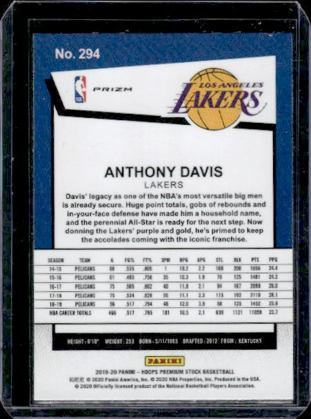 2019-20 Hoops Premium Stock #294 Anthony Davis Prizms Blue Cracked Ice