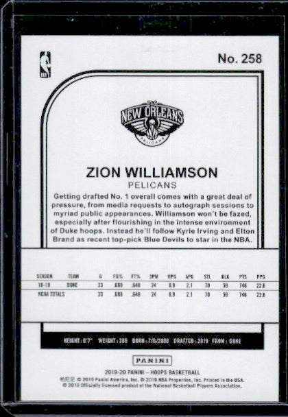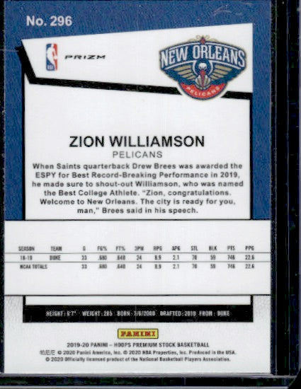 2019-20 Hoops Premium Stock #296 Zion Williamson Prizms Silver Scope RC