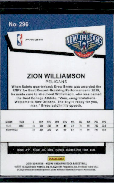 2019-20 Hoops Premium Stock #296 Zion Williamson Prizms Pulsar PSA 10 RC